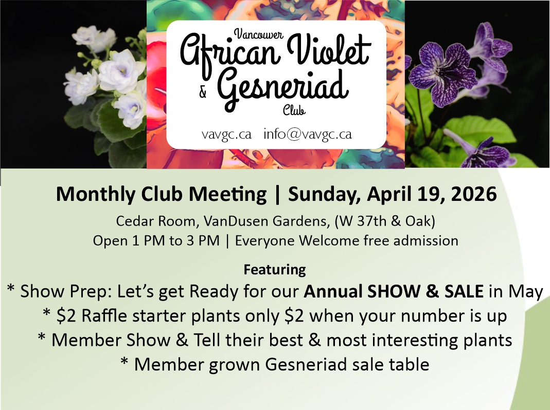 With Spring here and everything starting to bloom the Vancouver African Violet & Gesneriad Club will be hosting its monthly meeting on April 19, 2026 in preparation of our upcoming May 9, 2026 Annual Show & Sale!
